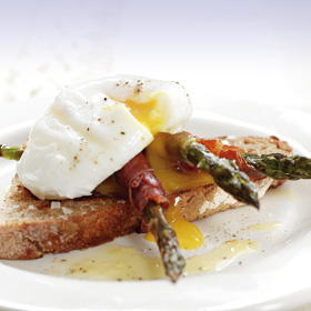 The English asparagus season only lasts a couple of months, so make the most of this delicacy by serving in different ways, such as with ham and eggs. Roasting asparagus gives a stronger, brighter taste than steaming or boiling.