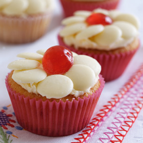 4 Beat remaining butter with icing sugar for butter icing and spread over top of cooled cakes. 5 Decorate with white chocolate buttons and glacé cherries.